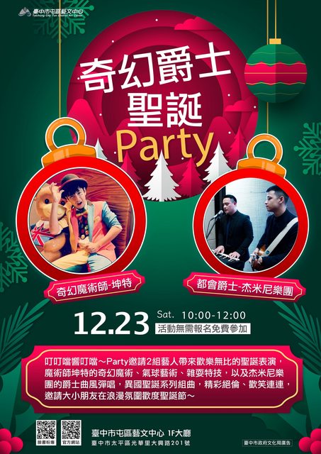 12月23日上午10點「奇幻爵士聖誕Party」,邀請Gemini樂團和坤特魔術師帶來精采表演,