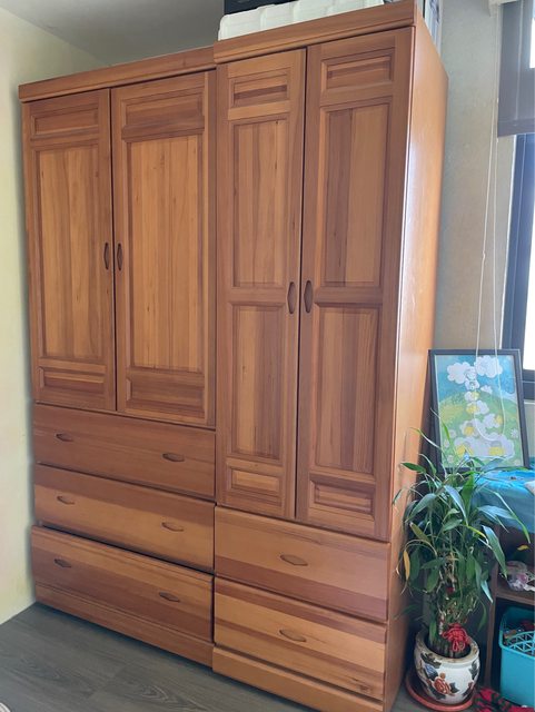 1. 實木衣櫃:內部可用空間大,上層有吊衣桿方便掛衣服,關門有緩衝裝置,三層抽屜
