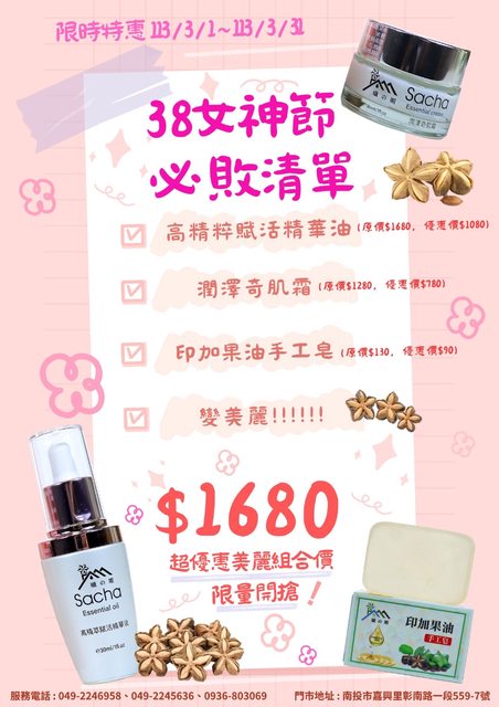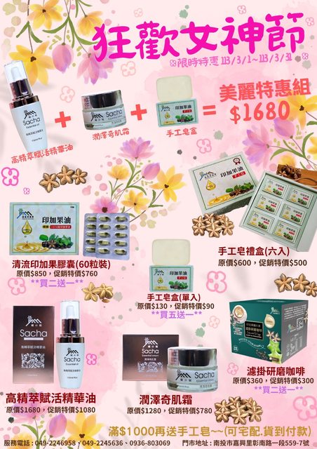 我們推出38婦女節保養品促銷,推廣分享給各位朋友,歡迎站內信或電話洽詢下單,謝謝