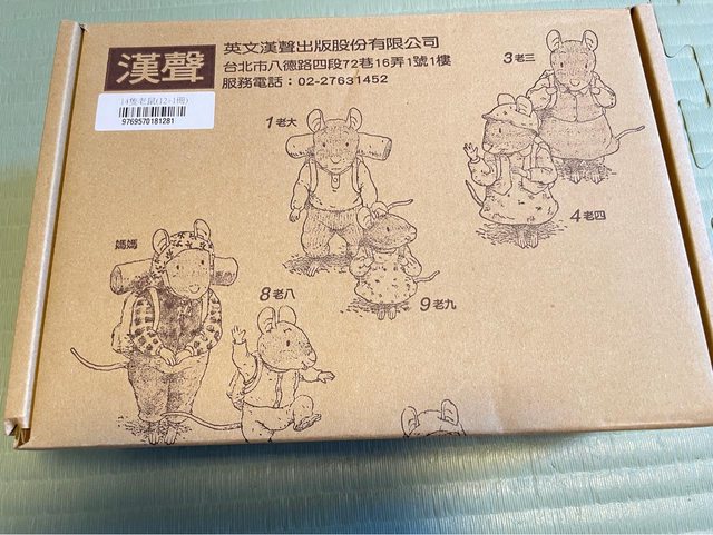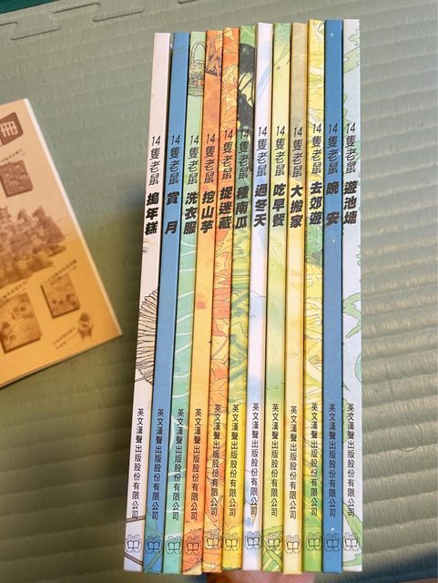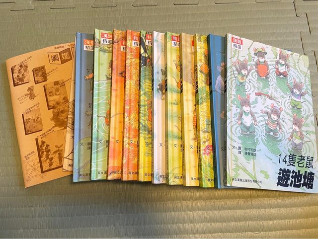 12.近新漢聲14隻老鼠系列繪本(12本) 2500元(含盒/導讀手冊),置書櫃中,書上面 有些許灰塵