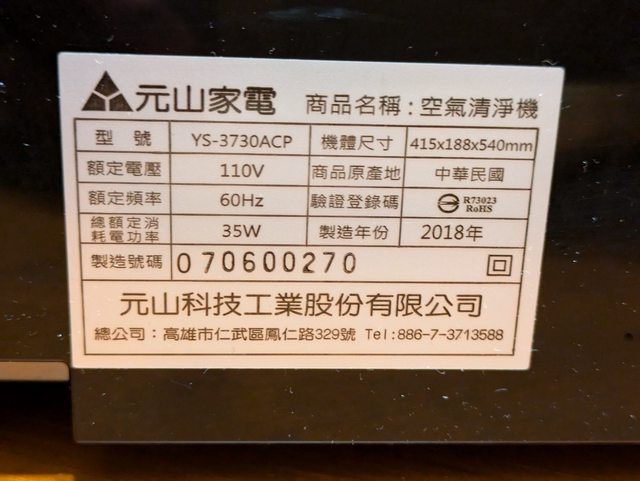 標題[交易] 元山 YS-3730 ACP DC變頻空氣清凈機