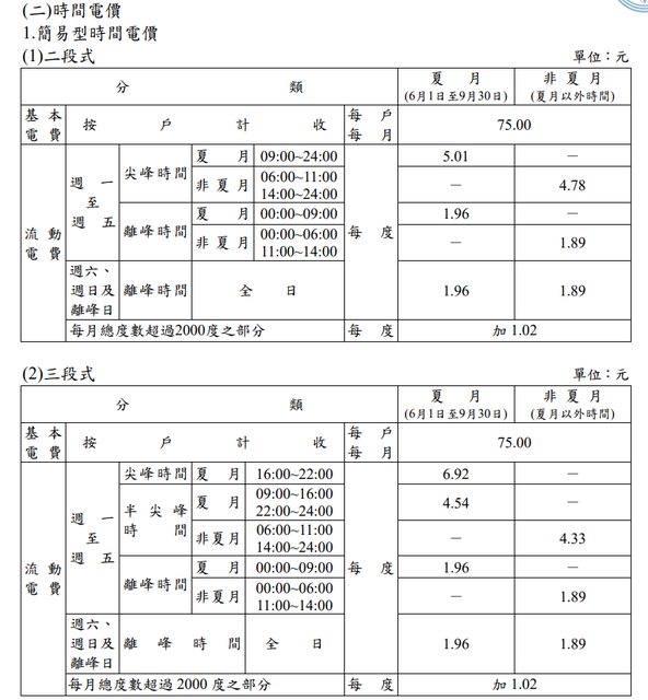 2.時間電價(分兩段式和三段式)