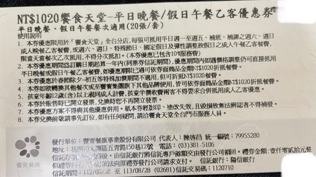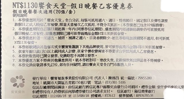 標題[交易] 饗食天堂 平日晚餐/假日午、晚餐 餐券