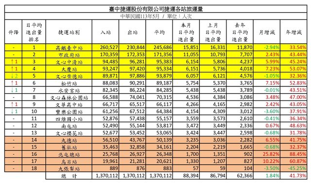 標題Fw: [情報] 台中捷運113年5月各站旅運量