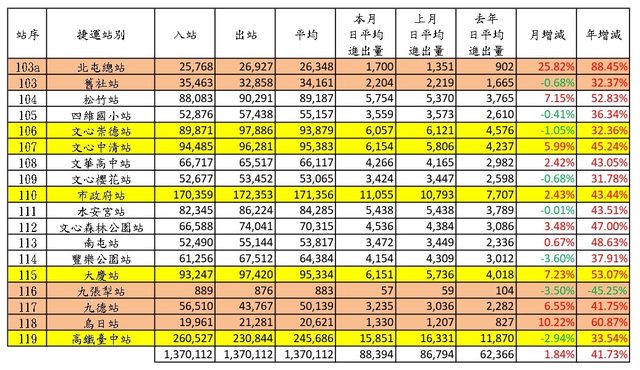 5、本文參考 Sunny821210、TaiwanXDman板友高雄捷運各站旅運量的發文格式。