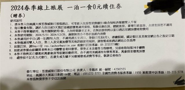 標題[商業] 大溪威斯丁一泊一食續住券