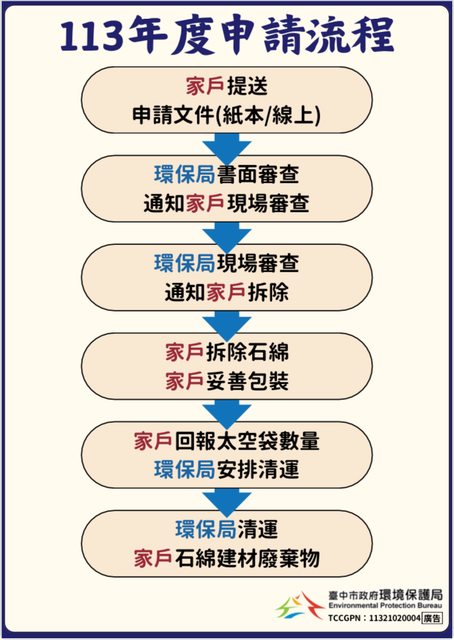 如有疑問,請洽臺中石綿專線:0963-875852或04-22289111轉66427(廖小姐)