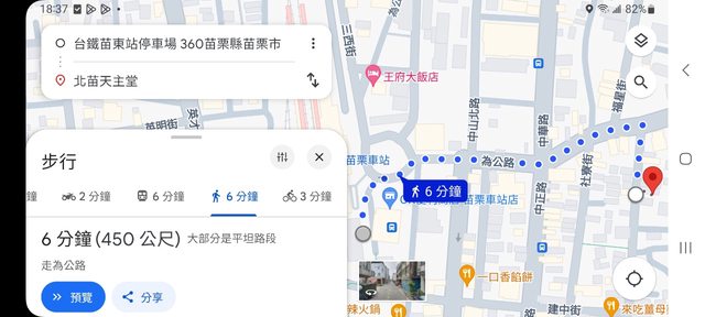 附上少女之家旁邊的北苗天主堂到苗栗火車站的路線地圖