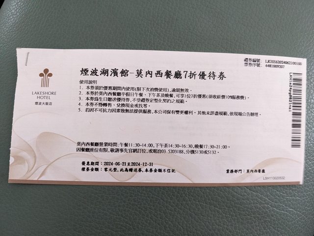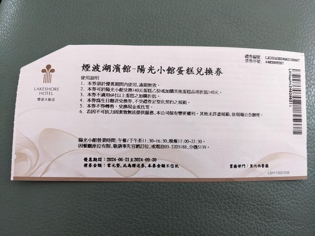物品:新竹煙波西餐廳7折券&蛋糕兌換券