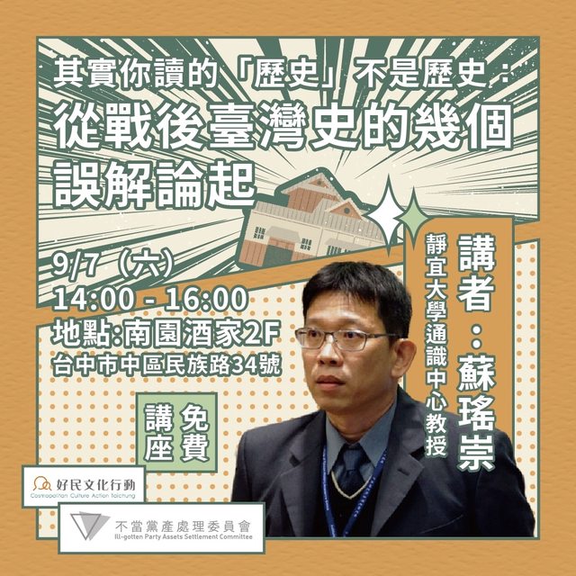 本場講座邀請靜宜大學通識中心蘇瑤崇教授前來分享,他將從戰後台灣史的幾個誤解出發,
