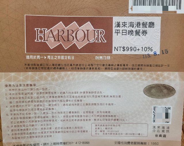 商品名稱:漢來海港實體餐卷2張(1010*2) 平日晚餐