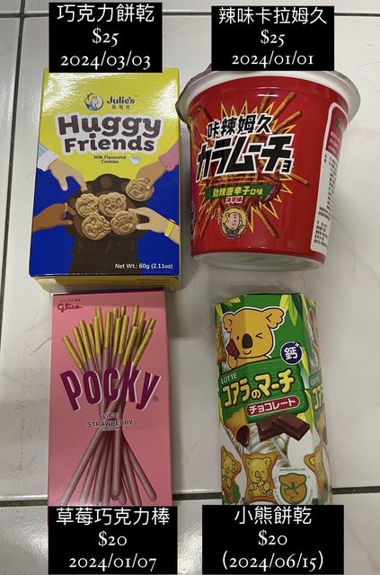 一些零食泡麵飲料,價格及有效期限皆標示在圖片上,便宜賣