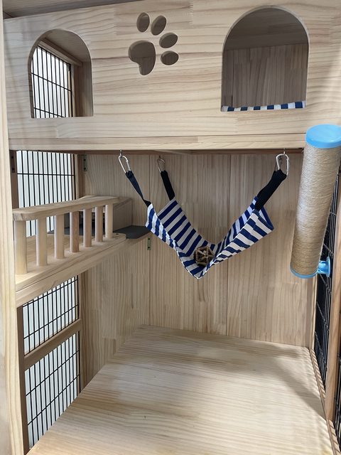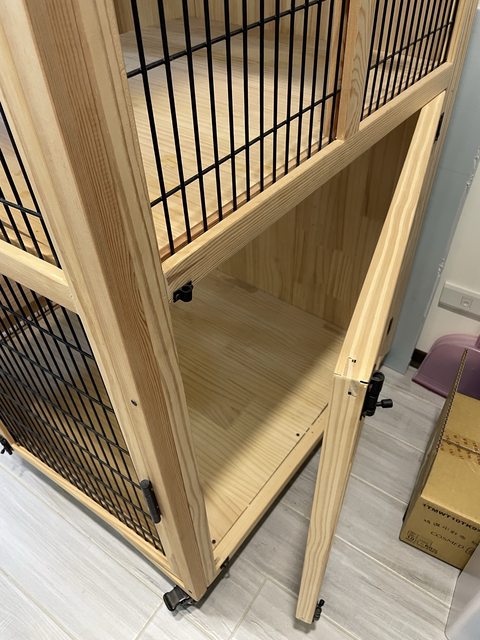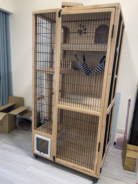 優點:有多層,可當貓咪跳台,至少可以住2-3隻貓咪,非玻璃門較透氣,貓咪不悶熱。