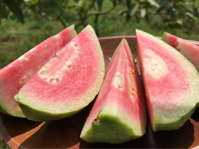 我們的紅心芭樂水份夠略帶點澀味,咀嚼時清甜的芭樂香在口中交錯會忍不住一口又一口