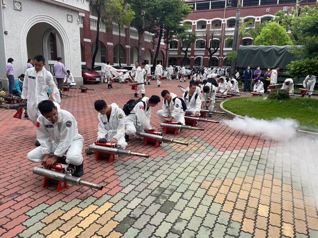 台南市衛生局在永康復華里噴藥防治,相關人員清噴槍時,