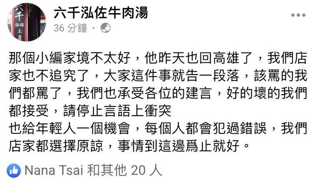 那個小編家境不太好,他昨天也回高雄了,我們店家也不追究了,大家這件事就告一段落 ,該罵的我們都罵了,我們也承受各位的建言,好的壞的我們都接受,請停止言語上衝突 也給年輕人一個機會,每個人都會犯過錯誤,我們店家都選擇原諒,事情到這邊爲止就好 。 ---------------------------- 老闆,請專心把牛肉湯做好就好 其他的事情 我們饕客真的一點也不在乎 -- ※ 發信站: 批踢踢實業坊(ptt-web.org.tw), 來自: 111.254.166.57 (臺灣) ※ 文章網址: https://ptt-web.org.tw/Tainan/M.1693281142.A.BC2