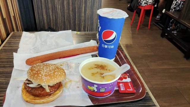 味,整體的味道搭配的還算不錯吃,再加上超長熱狗與玉米濃湯