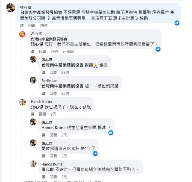 南牛肉節活動拖欠張心傑等人的部分。