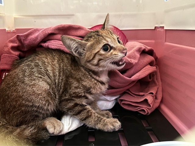 隔天帶著她去看醫生,醫生說她是隻一個月左右的小女貓,身體很健康!眼睛大顆,叫聲