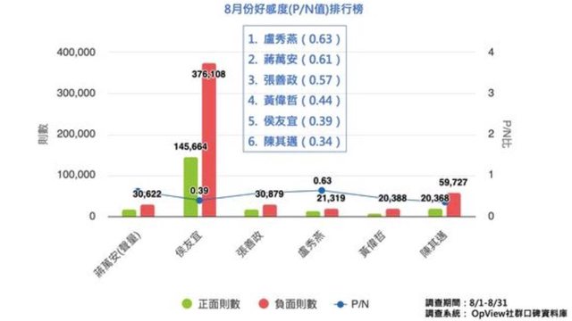 《OpView社群口碑資料庫》公布8月份六都市長好感度。(圖/OpView社群口碑資料庫)