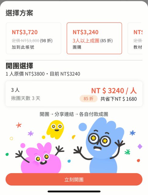 3人團購價$3240,尚缺一人,