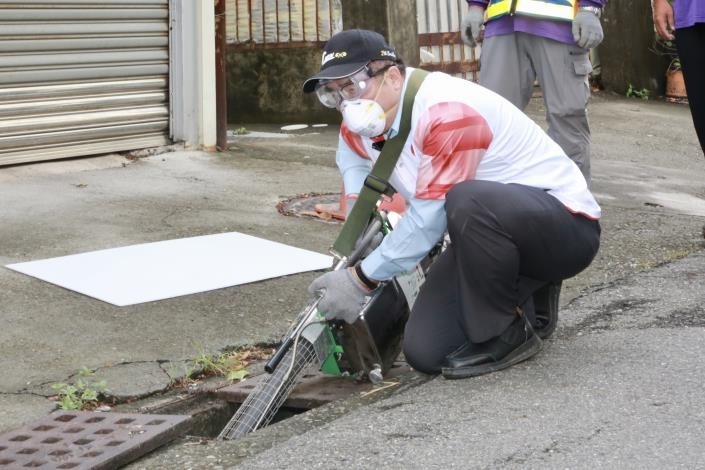 市長黃偉哲今日再度親自操作機器視察天溝並動手噴藥,他指出,雨後一週是登革熱防治
