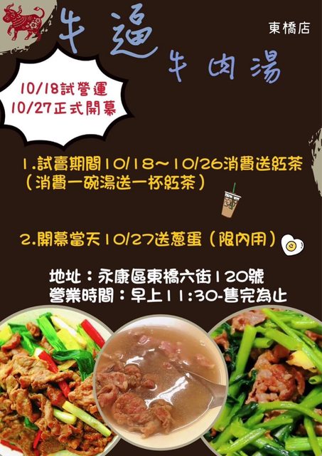 親友家的牛肉湯將於10/18試營運 地點在永康東橋六街120號-牛逼牛肉湯 https://maps.app.goo.gl/4Cr1xpxRSydA1w847?g_st=il 試賣期間10/18-10/26消費一碗湯即贈送一杯紅茶 開幕當天10/27送蔥蛋(限內用) 喜愛牛肉湯的朋友~歡迎來喝碗溫暖的湯、吃好吃的肉肉! 營業時間上午11:30-售完為止 https://i.imgur.com/LxeuR4U.jpg