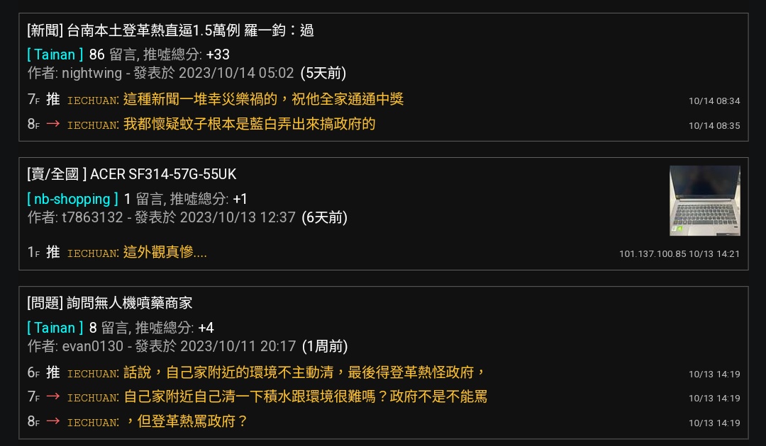 推 forsakesheep: IECHUAN說蚊子都是藍白派來的你還期待什麼 10/19 14:20