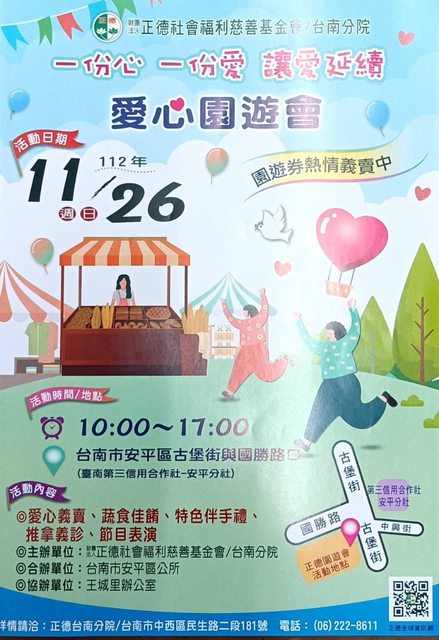 徵求內容:11.26正德於安平區辦理愛心園遊會,想徵求攤商擺攤-素食類(攤位費用自付