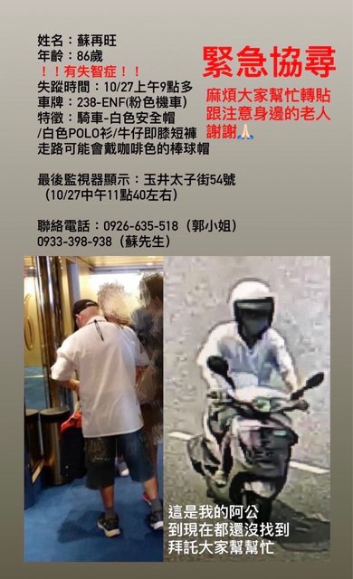 姓名:蘇再旺 年齡:86歲 !!有失智症!! 緊急協尋 失蹤時間:10/27上午9點多 車牌:238-ENF(粉色機車) 麻煩大家幫忙轉貼 特徵:騎車-白色安全帽 跟注意身邊的老人 白色POLO衫/牛仔即膝短褲 謝謝小 走路可能會戴咖啡色的棒球帽 最後監視器顯示 :玉井太子街54號 (10/27中午11點40左右) 聯絡電話:0926-635-518(郭小姐) 0933-398-938(蘇先生) https://i.imgur.com/8zB8u3o.jpg