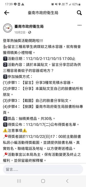 台南市衛生局透過臉書辦登革熱有獎問答抽獎活動,宣導登革熱防疫。 圖/南市衛生局提供 聯合新聞網 https://udn.com/news/story/7326/7545045 -- ※ 發信站: 批踢踢實業坊(ptt-web.org.tw), 來自: 118.232.71.174 (臺灣) ※ 文章網址: https://ptt-web.org.tw/Tainan/M.1698837511.A.598
