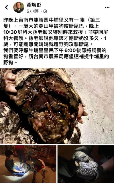 晚又發現1隻穿山甲尾巴疑遭遊蕩犬咬斷一截,通報後送往屏科大野生動物收容中心救治