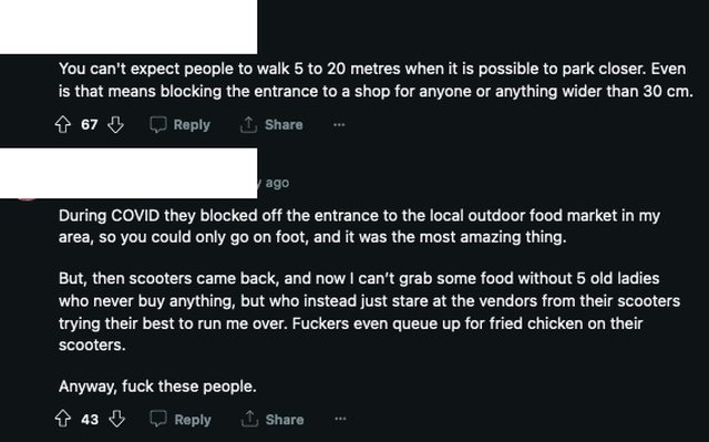 3. 當有可能停車更近時,你不能期望人們走5到20公尺。即使這意味著封鎖商店入口, 讓任何寬度超過30公分的人或物都進不去。 4. 在COVID期間,他們封鎖了我家附近的市場的入口,所以你只能步行進入, 那真是太棒了。 但後來機車又回來了,現在我想買些食物都不行,因為總有五個從不買任何東西的老太太 ,她們只是騎著機車盯著攤販看,盡她們最大努力想撞倒我。這些家伙甚至騎著機車排隊 買炸雞。 無論如何,搞這些的人真的很煩。 https://i.imgur.com/tfeXvXF.png