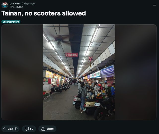 剛在reddit 台灣版看到 台南,禁機車進入標註為笑話/娛樂 https://i.imgur.com/7JRhiPy.png
