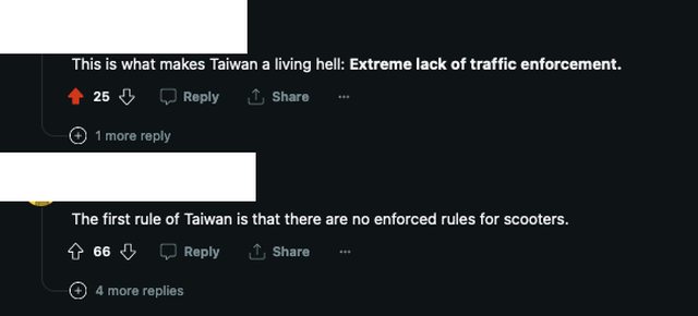 5. 這正是把台灣變成地獄的原因:極端缺乏交通執法 6. 台灣的第一條規則就是機車沒有強制執行的規則。 https://i.imgur.com/y4sMMn3.png