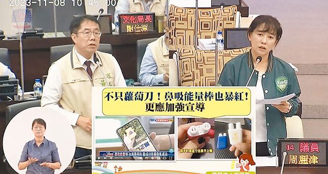 台南市議員周麗津(右)8日質詢時表示,「鼻吸能量棒」已侵入台灣校園,市長黃偉哲