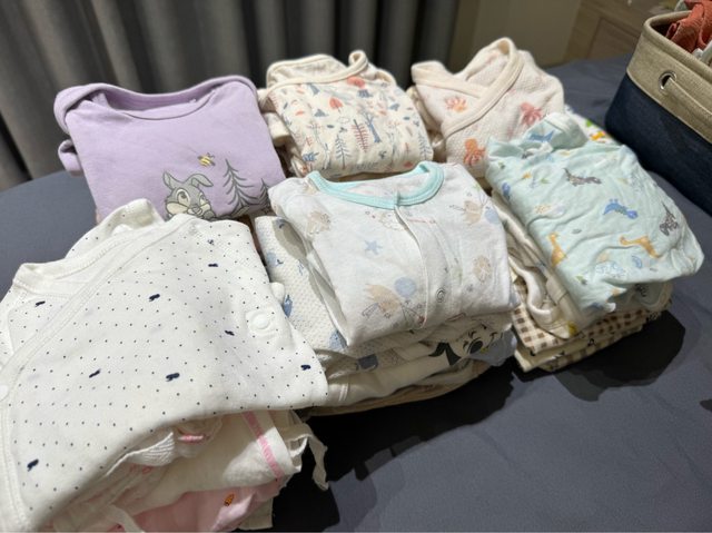 有全新的紗布衣、懶人包巾一條、60碼衣服大概三套、幾乎是70碼的衣服