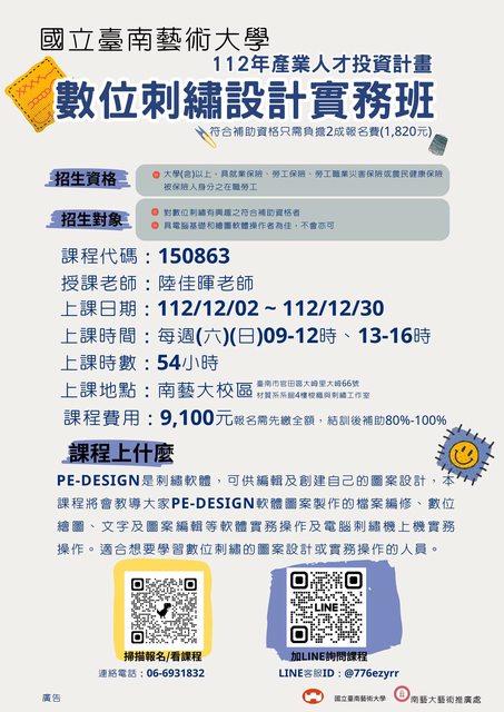 政府補助產業人才投資計畫課程「數位刺繡設計實務班」,只要報名至開課當天符合在職資