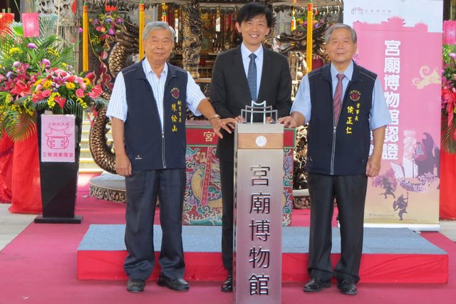 台南市副市長葉澤山(中)15日頒發宮廟博物館認證給北門區三寮灣東隆宮,由東隆宮董