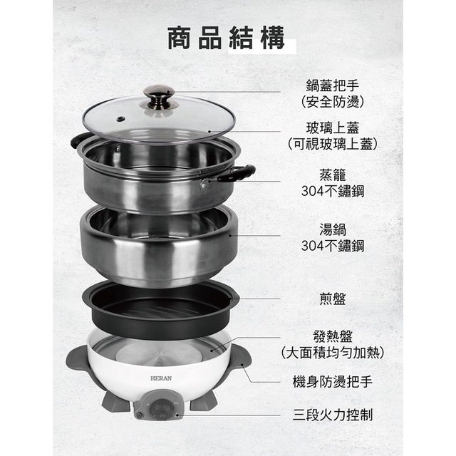 304 不鏽鋼、4L 湯鍋、烤煎盤、蒸籠、 可上蒸下煮、方便拆洗