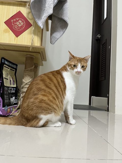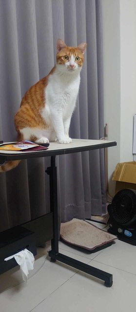 外觀:橘白相間、身上無項圈及胸背帶、身長約50cm 體重約8公斤(胖) 、年齡約1歲半