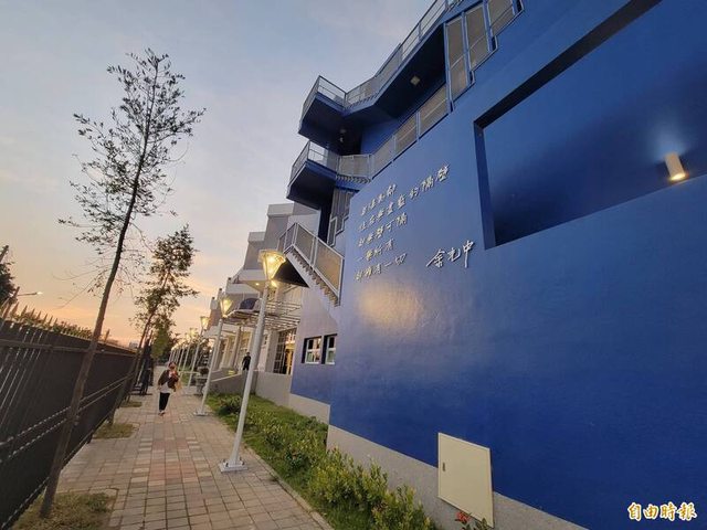 跳脫整體城堡外牆顏色,以天空藍跳色設計文學牆嵌入余光中《與海為鄰》字句。(記者