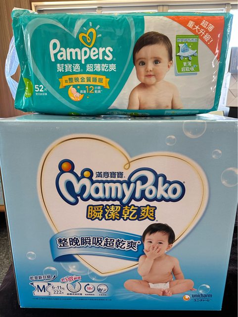 2. 滿意寶寶瞬潔乾爽M號1箱+幫寶適超薄乾爽L號1包 合售$1,000