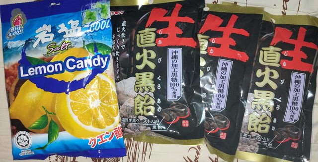 9. 3包日本生直火黑糖飴加1包岩鹽檸檬糖,4包售150元,有效期限2024/4月