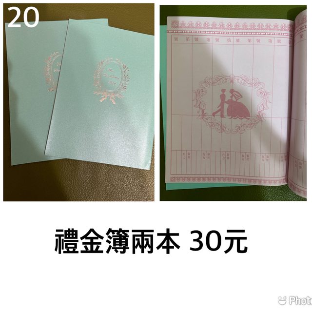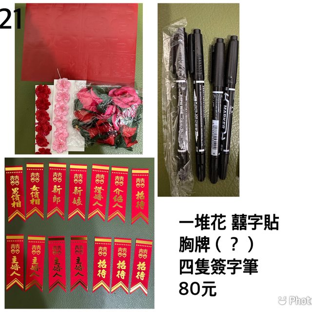 21. 一堆花、囍字貼、胸牌(名牌?)、四隻簽字筆