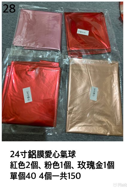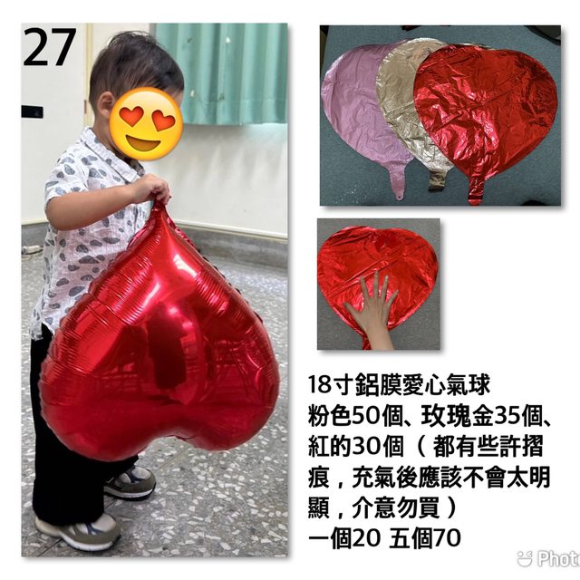 27. 18寸鋁膜愛心氣球。粉色50個、玫瑰金35個、紅的30個(都有些許摺