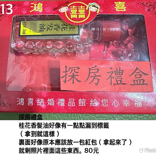 桂花香髮油好像有一點點漏到標籤(拿到就這樣)裹面好像原本應該放一包紅包(拿起來了