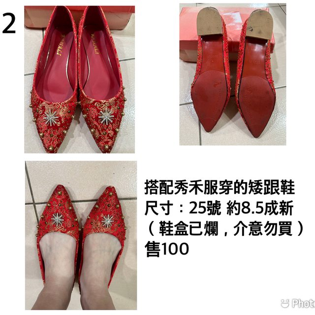 2. 搭配秀禾服穿的矮跟鞋。尺寸:25號 約8.5成新,(鞋盒己爛,介意勿買)。