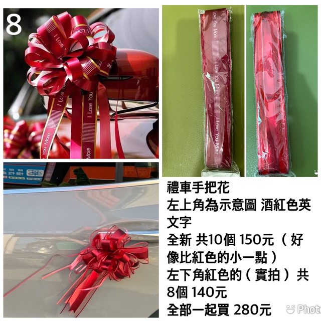 8. 禮車手把花,酒紅色英文字 (看起來比紅色小一點點)全新 共10個 150元。