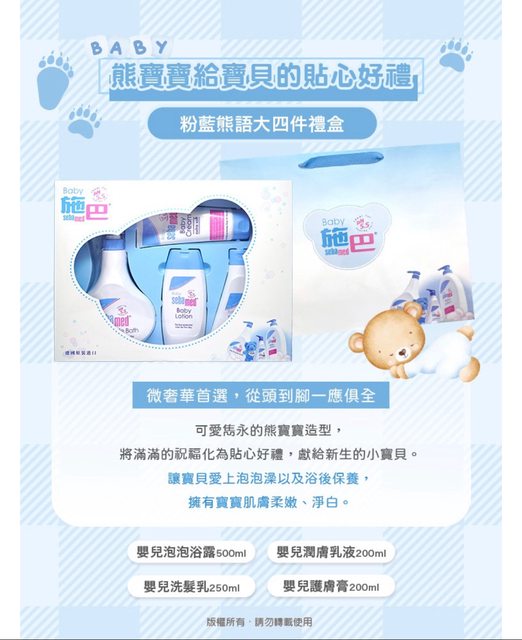 3.施巴 嬰兒粉藍熊語大四件禮盒$1000